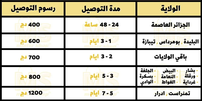 نوفر لكم خدمة التوصيل السريع لـ 69 ولاية جزائرية مع إمكانية الدفع عند الإستلام، أي تخلص كي توصلك السلعة،